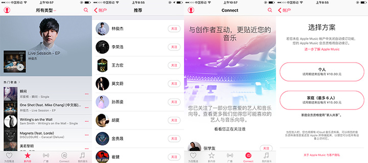 打开 Apple Music 后会发现,苹果已经针对国内的音乐以及音乐人做出了改动,选择订阅艺人,耳熟能详的歌手尽在其列。而通过 Connect 功能,音乐人还可以分享歌词、后台照片、视频,甚至直接用 iPhone 向乐迷们发布最新的歌曲。
