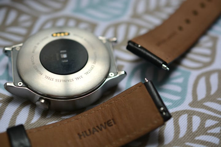 翻过来看看背面,就能看到标配的光学心率监测器和无线充电模块。评测称心率感应并不是特别灵敏,读数一次大概需要 10 秒,而静态下连测两次数值差异也较大。用自带的应用测试与 Google Fit 测试的读数也有 5-10 次心跳的差异。至于充电,华为没有使用 Moto 风的华丽小钟,选择了简单的薄片式磁贴充电器。