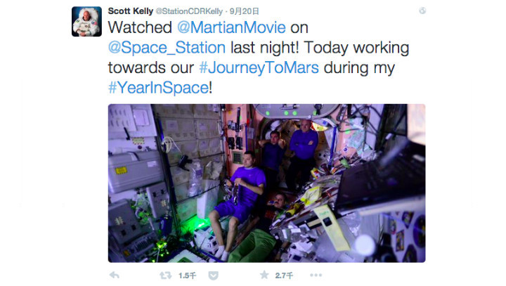 在正式上映以前,NASA 就组织过一次集体观影,让宇航员们在太空率先观看本片。宇航员们表示很开心,为了表达心情,不少人还发了 twitter。