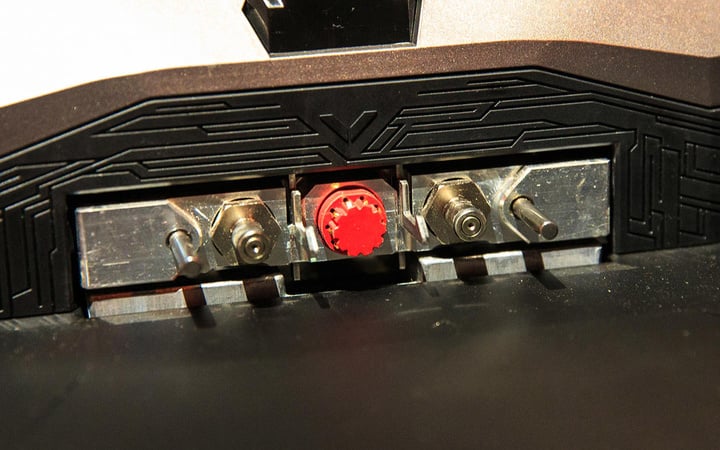 紧挨着固定杆的内测,是两个喷嘴,用来输送和回收冷却液。剩下的中间一个红色的接口则应该是用来提供电力供应的。把笔记本放置上去之后,按下扩展坞后方的压杆进行固定。