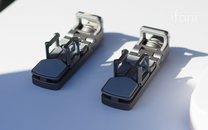 灵眸标配手机支架,通过螺丝以及卡口和手柄连接,这款手机支架的固定方式和外观都与市面常见的自拍杆手机支架有很大的区别。