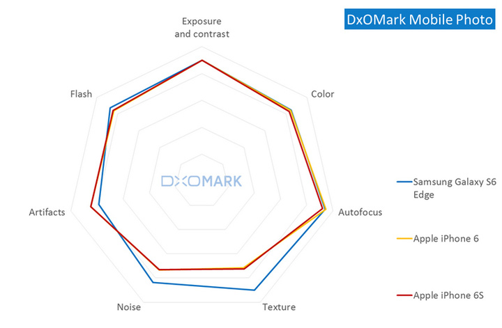 将 iPhone 6s 和 iPhone 6 以及三星 S6 edge 进行比较。静态照片方面,iPhone 6s 和 iPhone 6 在曝光和对比度、色彩还原、自动对焦、纹理和细节、信噪比、失真以及闪光灯成像等六个子项目的各项成绩近乎一致;而 iPhone 6s 在纹理和细节、及噪点方面逊色三星 S6 edge 较多。
