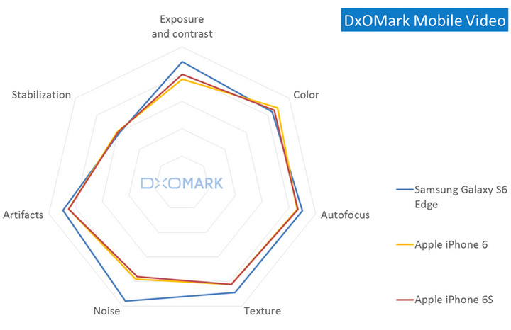 视频拍摄部分,iPhone 6s 和 iPhone 6 的各子项目成绩继续保持近似,但两者均在曝光和对比度、噪点、纹理细节方面逊色于三星 S6 edge。