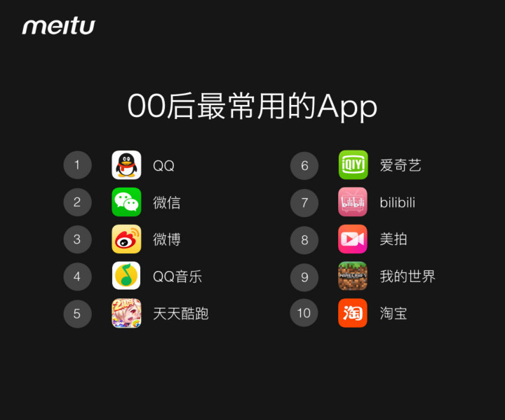调查显示:在“00后”最常使用的 app 中,QQ 远远超过微信(前者是 72.6%,后者是 27.4%);像游戏 app 比如“天天酷跑”和“我的世界”,也位列前十。如图所示: