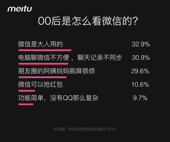 当然,美图公司的调研肯定少不了自拍修图这点,在谈到他们都用什么 app 修图时,排在前三的答案分别是:美图秀秀、“我天生丽质,不用修图”和美颜相机。著名照片app Instagram 排名第四。