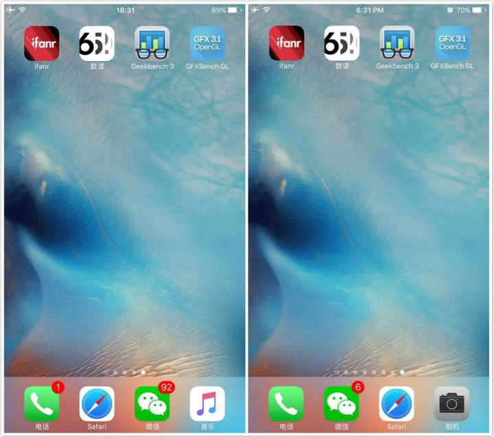 一小时十分钟的视频播放结束以后,台积电 A9 处理器版 iPhone 的剩余电量为 69%,三星 A9 处理器版 iPhone 的剩余电量为 70%。