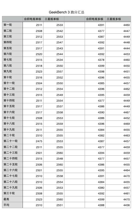 和之前的一些传闻不同,三星 A9 处理器版 iPhone 6s Plus 的跑分成绩并没有出现越往后成绩越下降的情况,相反,三星 A9 处理器版 iPhone 的三十次跑分,每一次均高于台积电 A9 处理器版 iPhone。三星 A9 处理器版 iPhone 的三十次跑分成绩,单核平均分 2551、多核平均分 4456,相比台积电 A9 处理器版的单核 2510 、多核 4388,分别高了 1.6% 和 1.5%。