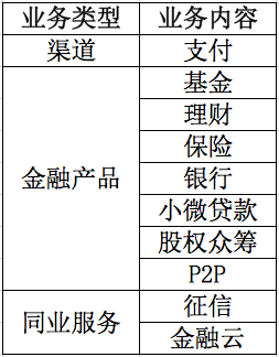 现在再回来看蚂蚁金服的 10 大业务,其中基金、理财、银行、小微贷款、保险、股权众筹、P2P 这 7 大业务其实都可以归类为“金融产品”,而支付宝则是一条销售渠道,征信、金融服务则是为同业机构提供支撑性服务的业务,性质有所不同。至此,我们可以将蚂蚁金服的业务总结为如下一张表格: