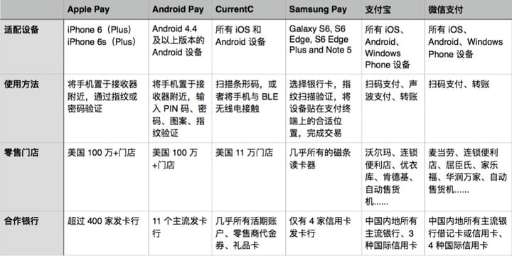 在 2015 年初的 MWC 大会上,三星发布了自家收购移动支付公司 LoopPay 后的新业务——Samsung Pay,Google 也宣布在研发新的 Android Pay 框架。纵观整个移动支付市场,能够称得上规模化应用的品牌除了 Apple Pay, Samsung Pay, Android Pay 以外,还有我们耳熟能详的 Square, Paypal,以及移动支付网络联盟 MCX 发布移动支付工具 CurrentC。而在 Apple Pay 尚未进入的中国,已经形成了支付宝、微信支付双雄争霸的局面。