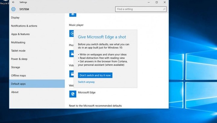 2. 微软希望通过弹窗阻止用户修改 Windows 10 默认浏览器。在最新的 Windows 10 预览版更新(Build 10568)中,用户在将默认浏览器从 Edge 切换至其他浏览器时将会收到一个对话框,提示 “Give Microsoft Edge a shot”(看一看 Windows Edge 浏览器),用户可以选择继续使用 Edge 作为默认浏览器,也可以“毫不留情”地将 Edge 换下。
