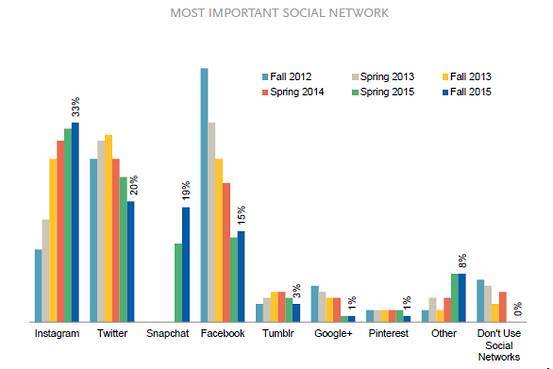 在这个调查中,新锐 Snapchat 的比例从 13% 上升到 19%,超越了 Facebook。