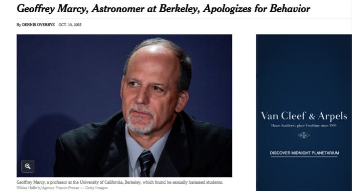 就在几天之前,伯克利分校天文学家 Geoff Marcy,世界公认的“行星猎手”,因涉嫌长期骚扰多名女学生,被迫引咎辞职。