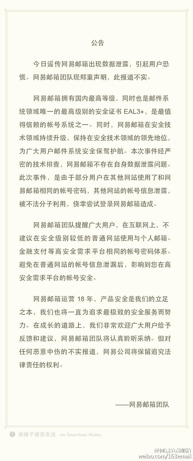 1. 网易官方辟谣,称邮箱不存在自身数据泄露问题。昨日网上出现报道,称网易邮箱出现数据泄露,随后网易官方发表声明,声明称本次事件经严密技术排查,网易邮箱不存在自身数据泄露问题。此次事件,是由于部分用户在其他网站使用了和网易邮箱相同的帐号密码,其他网站的帐号信息泄露,被不法分子利用,侥幸尝试登录网易邮箱造成。公告全文如上图。