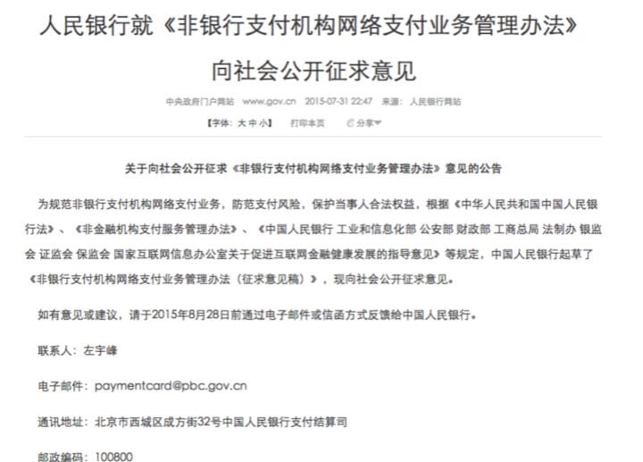 2015 年 7 月 31 日,央行发布了《非银行支付机构网络支付业务管理办法》,并向社会公开征求意见。