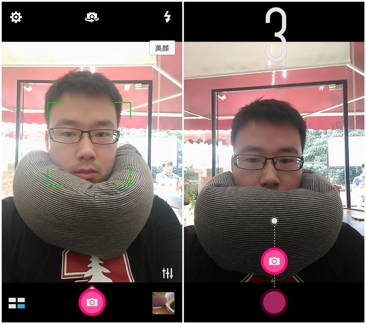 另一个核心功能的关键在于快门键,按住快门键往上滑动,可以启动拍摄延迟,最长五秒的拍摄延迟时间的意义在于,单手握持手机并点击快门拍照很容易握持不稳,造成晃动,影响拍照效果。有一个延迟时间能够让用户更舒适的握持手机,更专心地摆表情,也方便招呼闺蜜们环顾左右营造和谐社会盛况。