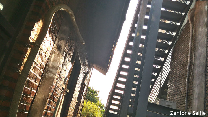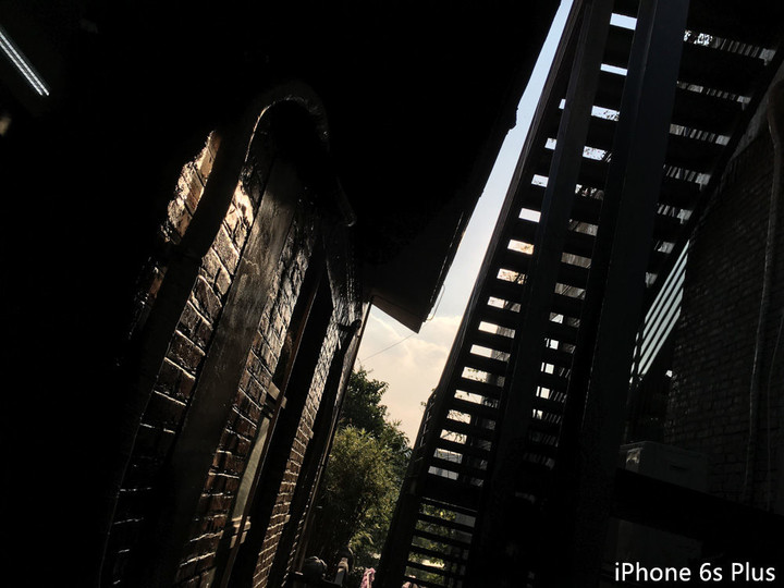 在这一组对比当中,iPhone 6s Plus 和 Zenfone Selfie 的反差就非常之明显,前者整体缺少暗部细节,不过画面质感不错。而在 Zenfone Selfie 这边,HDR 模式下,墙体的细节清晰可见,不过缺点也很明显,天空部分过曝了,然后楼梯空处的紫边控制不够好。