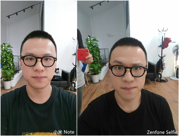 这组对比反映了两个结论:一是 Zenfone Selfie 摄像头角度更广,适合多人一起自拍。而是 Zenfone Selfie 和小米 Note 的取向不同,小米 Note 在轻度美颜下,显得皮肤非常红润,而 Zenfone Selfie 则更倾向于本来的肤色。