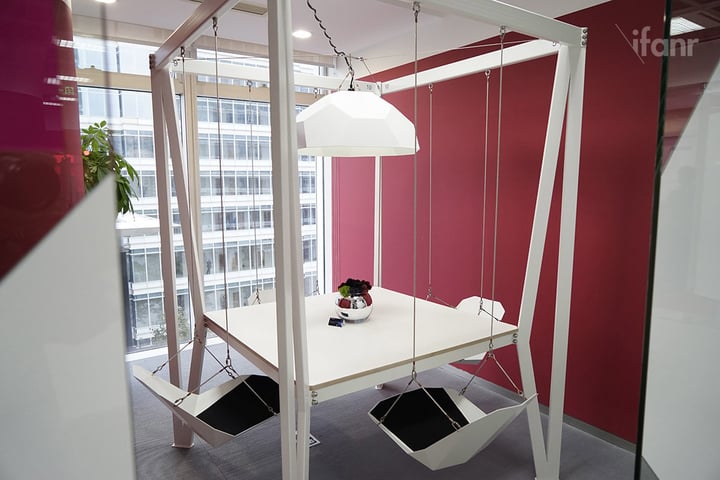 而作为全公司提供创意的实验室,灵感的激发也相当重要。所以在戴姆勒 IT 实验室,还有一个粉刷上粉红色油漆的房间,里面摆着一张秋千式的椅子,营造出一种轻松的氛围,让员工可以在里面畅聊各种想法。