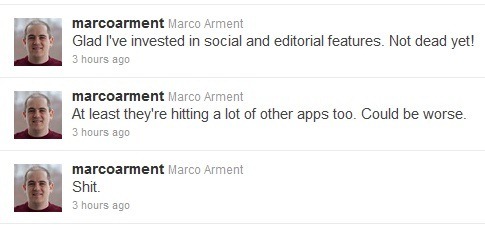 WWDC 2011 现场,Arment 在 Twitter 上喊了一句“Shit”。但是随后他在自己的博客上认为了这也是一件好事,因为 iOS 的保有量可以让更多人意识到这类应用程序的便利,无形中开发了这个市场,从而让其中愿意花钱获取更好体验的人购买 Instapaper。Instapaper 开发的社会化和编辑推荐模块也让他有这样的底气,苹果的抄袭也不一定是一个致命的威胁。