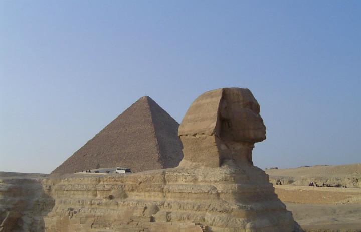 如图所示,是胡夫继承者卡夫拉建造的金字塔。其前伫立着长 73.5 米,高 20 米的狮身人面像斯芬克斯。据说到今天为止,对于人面像的制造者及制造初衷,人们还不是很清楚。