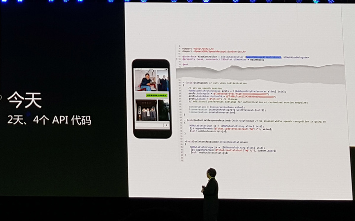 根据来自微软研究院的黄学东博士的介绍,基于这项服务,开发者两天就可以开发出一款语音搜索类 app。其中在现场演示的搜索照片的 iOS app 是黄学东博士用 Objective C 两个小时开发出来的,应用到 4 个 API,具体代码可以看下图。在 app 中,可以语音说一句话检索照片,比如“看看清华大学的照片”,便会自动根据“清华大学”这个地点检索相应的照片。