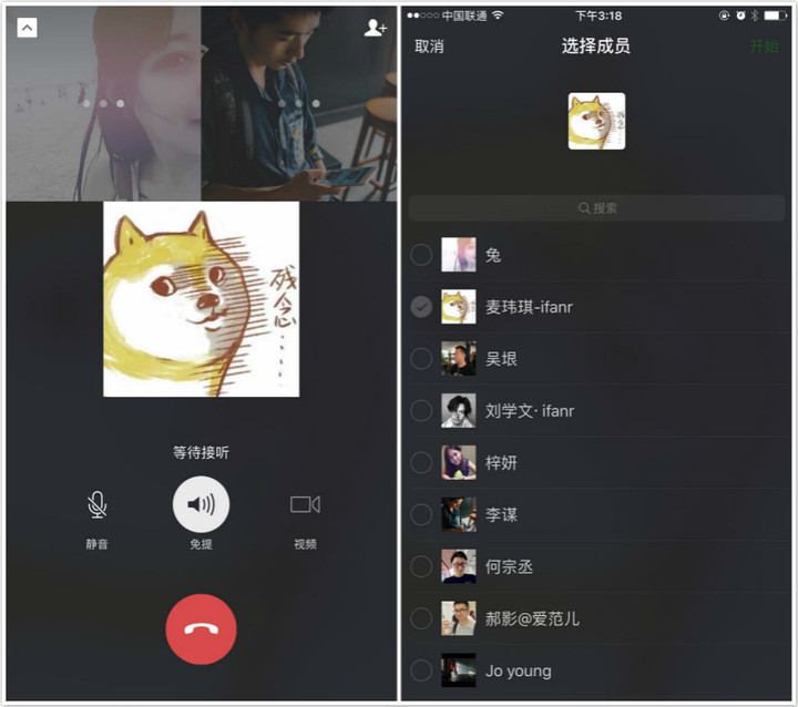 进入某一个微信群里,然后点击下方对话框右边的“+”号进入功能菜单,然后就会发现它多了一个“视频聊天”的功能按钮——进入之后,就直接进入群成员通讯录,挑选好“群视频”成员,然后按下右上角的“开始”。