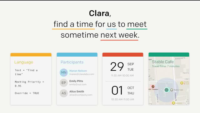 人工智能助理 Clara 看中的就是这个市场。它是一个内嵌在 E-mail 里的 AI 助理。不像 Siri 和 Cortana 那样需要用语音去唤醒,让 Clara 工作的方式是把相关邮件“抄送”给她。她最擅长的就是把你从日复一日、令人厌烦的日程安排中解救出来。当然还有更让你意想不到的功能:给你“老板般”的感觉。