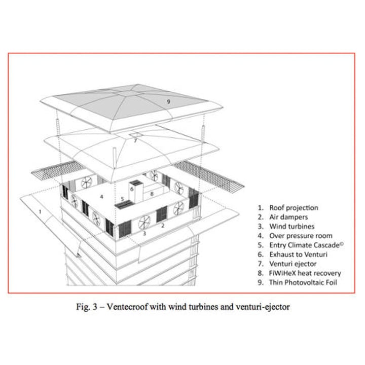这个系统是基于气候梯级的原则来实现的。首先,在大厦的顶部设置一个大型的通风口,风力涡轮机将从这里将空气抽入气体冷却槽内,气体在通过冷却槽之后再从另外的管道转入大厦的办公空间内。