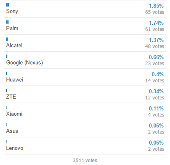 诺基亚这个品牌的结果倒是不那么让人惊讶,但诺基亚的投票率竟然高达了 41.56%,而它已经高出了第二名三星达 30 个百分点,第三名才是手机的发明者摩托罗拉,投票率为 9.4%。