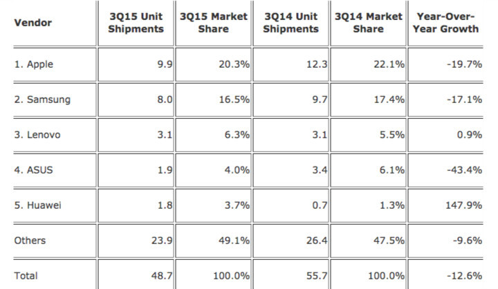 前三仍然是苹果、三星和联想,其次是华硕和华为。