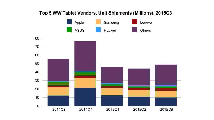 IDC 的数据显示,2015 年第三季度,联想的全球平板出货量为 310 万台,较去年同期增长 0.9%;市场份额为 6.3%,较去年同期增长 0.8%。