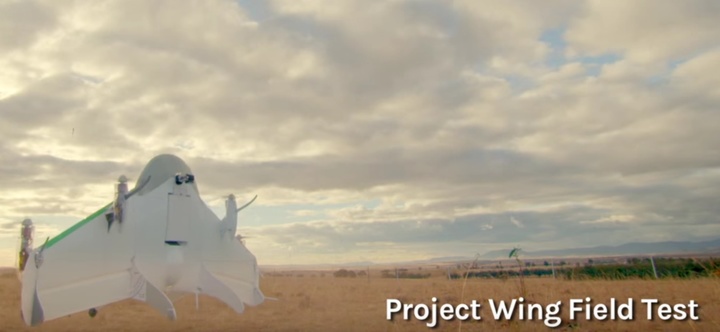 Google 曾在澳大利亚一个农场测试了 Project Wing 的无人机原型。由于飞行器采用混合型设计,利用 4 个电动推进器它既可以像直升机一样垂直升降,又可以在空中翻转以水平姿态飞行。