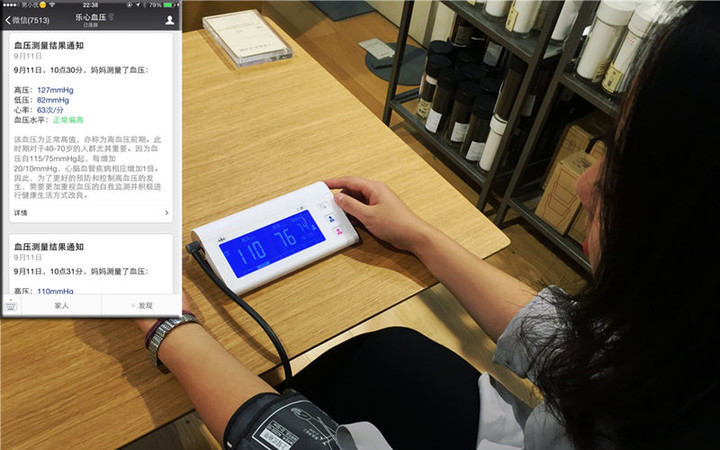 一种最常见的场景是:只要家中父母测量血压,接入到网络的血压计就会自动发送通知结果到子女微信,方便子女进行监控对比,了解父母基本的血压状况。根据测量结果,乐心也会分 7 天和 90 天的血压健康报告,自动发送到微信上,方便指导治疗。