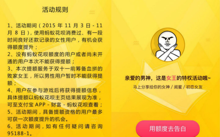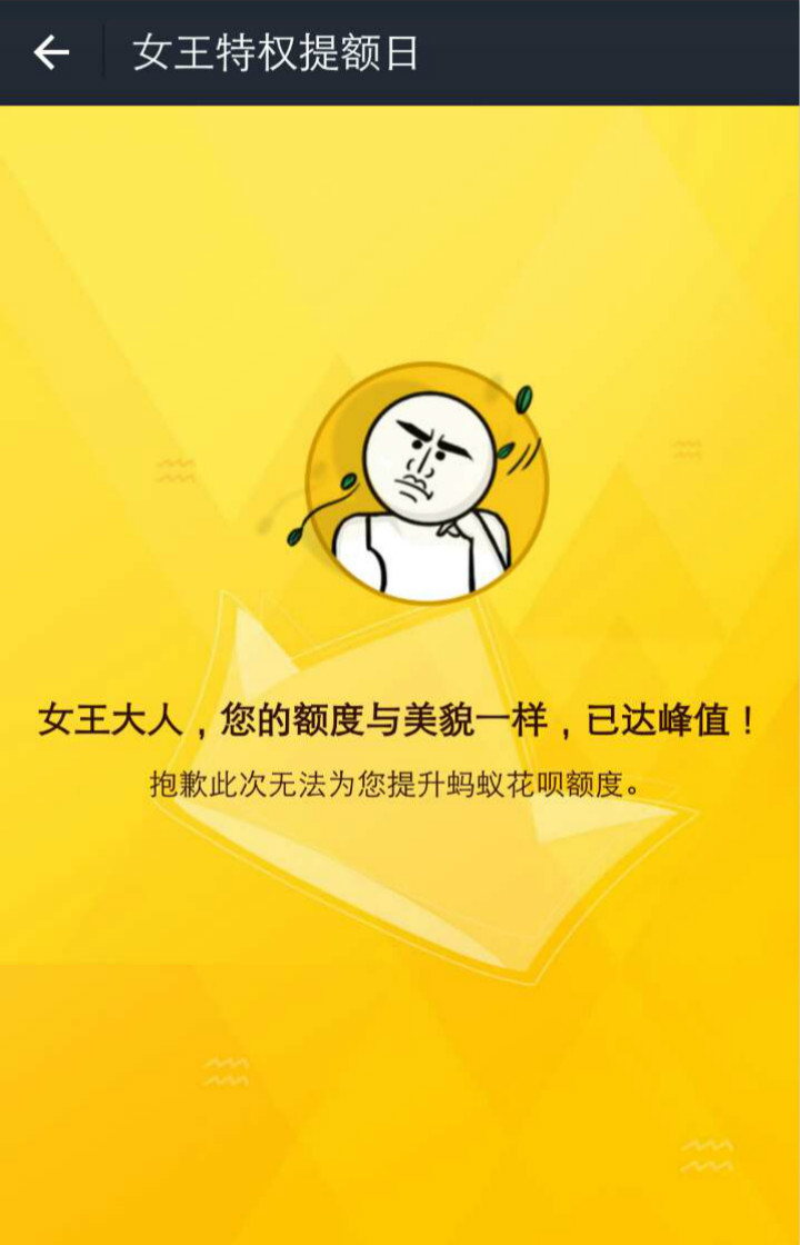 为了更好地服务于女性,蚂蚁花呗现在宣布给她们单独提额,人均提升 5000 元。(注:是临时额度)