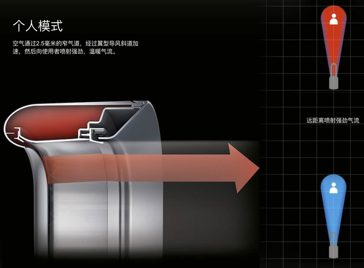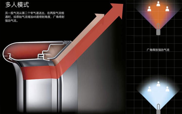 根据戴森给出的信息,三合一产品采用了新的喷射控流技术,实现集中和分散送风,也就是单人和多人两种模式。单人模式下,空气经过 2.5mm 的窄气道,然后从翼型导风斜道加速送出,对使用者吹送气流;多人模式下,会有另外一股气流从第二个窄气道送出,和前一股气流相遇时能增加原始气流的喷射角度,覆盖更大的空间。