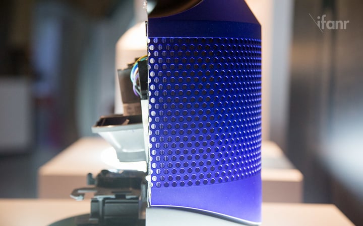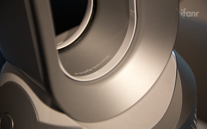 这款产品延续了戴森标志性的气流倍增技术,以及家族式的设计语言。外形和之前单一功能的无叶风扇产品十分相像。上端是迷之椭圆的出风口,下方的圆柱体上密密麻麻地布满了进气孔,内置玻璃纤维滤网。