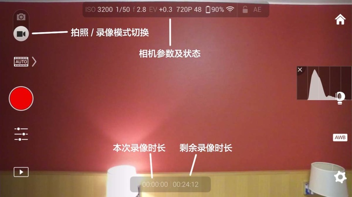 更多的相机设置和控制,需要通过 DJI GO 应用程序完成: