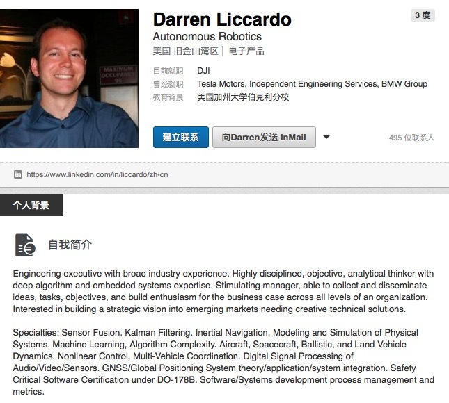 Darren Liccardo 受聘成为公司全球工程副总裁。此人在加盟大疆之前是特斯拉自动驾驶团队负责人,也曾在硅谷担任过宝马公司的自动驾驶技术研发团队负责人。Liccardo 多年前曾开发出首个获得美国联邦航空局认证的用于飞行器的惯性导航系统,堪称陆地和航空多面手。