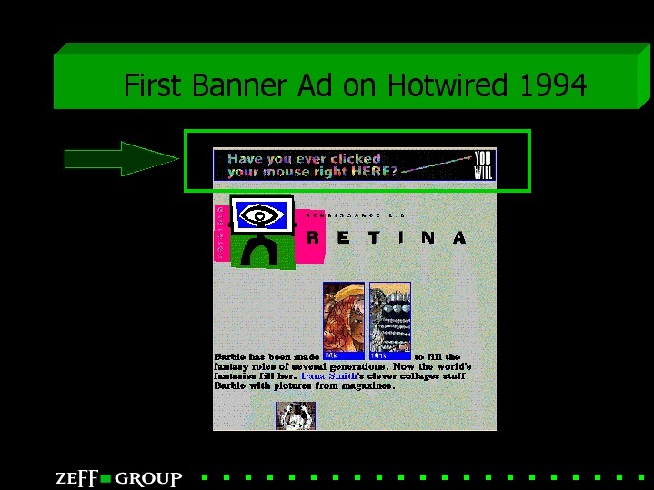 1994 年 10月,Wired 杂志在网络版 Hotwired 上挂了 14 家客户的横幅广告,其中 AT&T 的广告点击率达到了惊人的 44%。这是业界公认的第一次互联网广告的尝试。