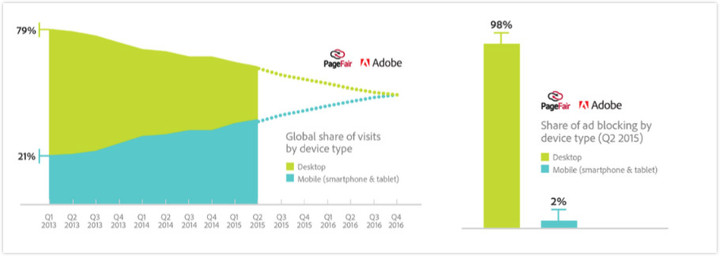 在 PageFair 和 Adobe Primetime 2014 年的报告中,描述移动端屏蔽广告状况时还用了“negligeble(微不足道的)”这个词。到了 2015 年,这份报告称“移动端已经是能影响屏蔽广告发展的一个因素了”。