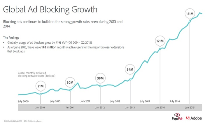PageFair 和 Adobe Primetime 联合出品的 2015 年度报告显示,全球共有 1.98 亿的月活跃用户使用主流浏览器插件屏蔽广告,同比增长 41%。尽管 1.98 亿仅仅是全球互联网用户的 6%,但却造成了 218 亿美元的广告支出损失,占全球广告支出的 14%。