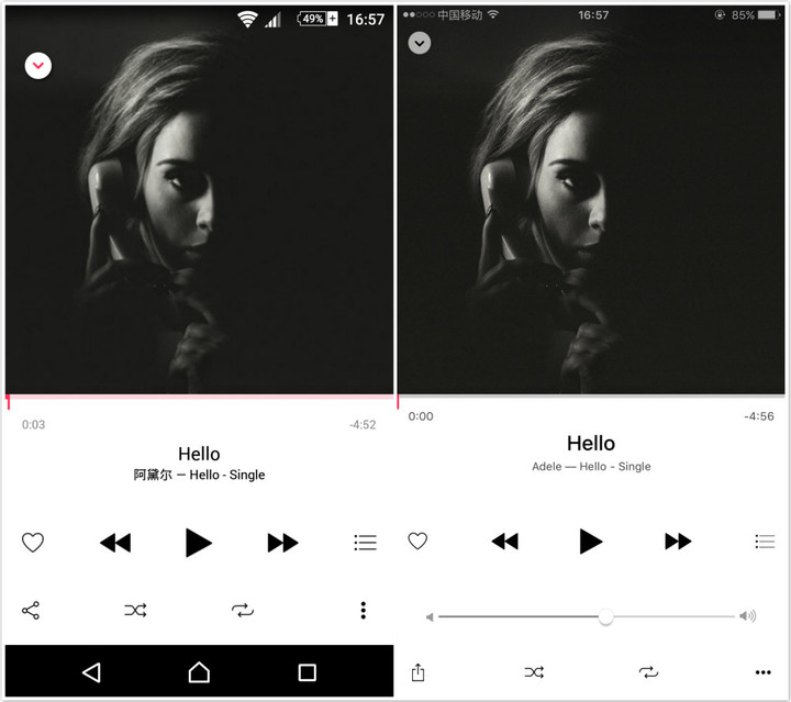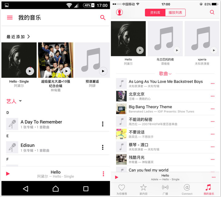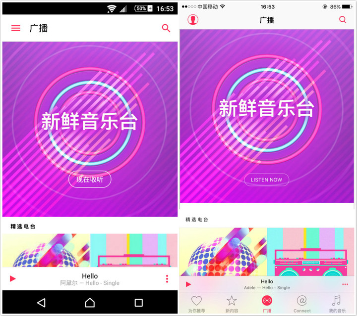 (以上分别是我的音乐、广播、为你推荐界面,左为 Android 版,右为 iOS 版)