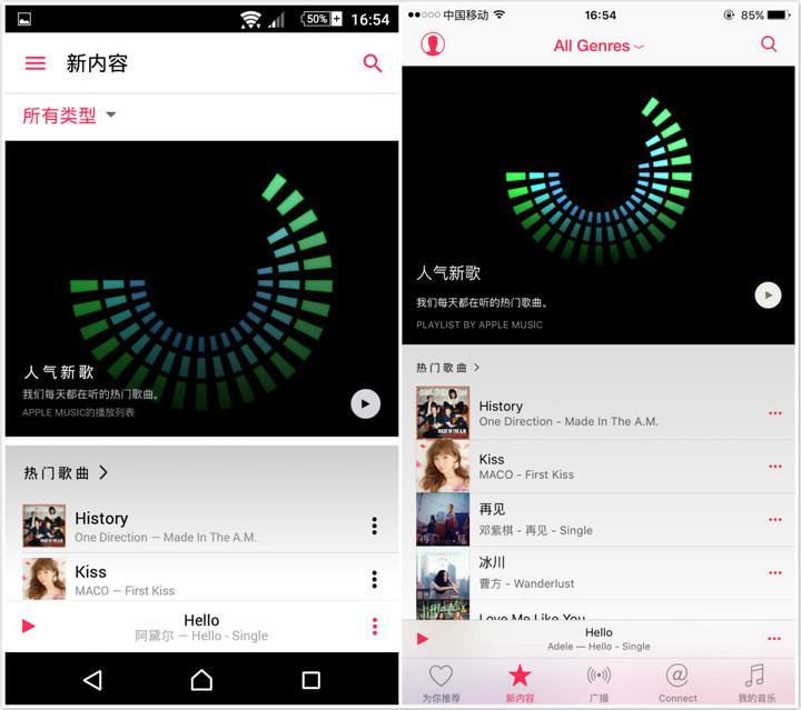 Apple Music 的 Android 版与 iOS 版的区别主要存在于一些交互方式的不同,而内容方面暂时并没有发现不同,只是 MV 和家庭套餐功能暂时缺失。只要是使用相同的 Apple ID 登录,Android 版 Apple Music 和 iOS 版收到的推荐内容是完全一样的。对于喜欢的音乐也可以离线到本地保存。