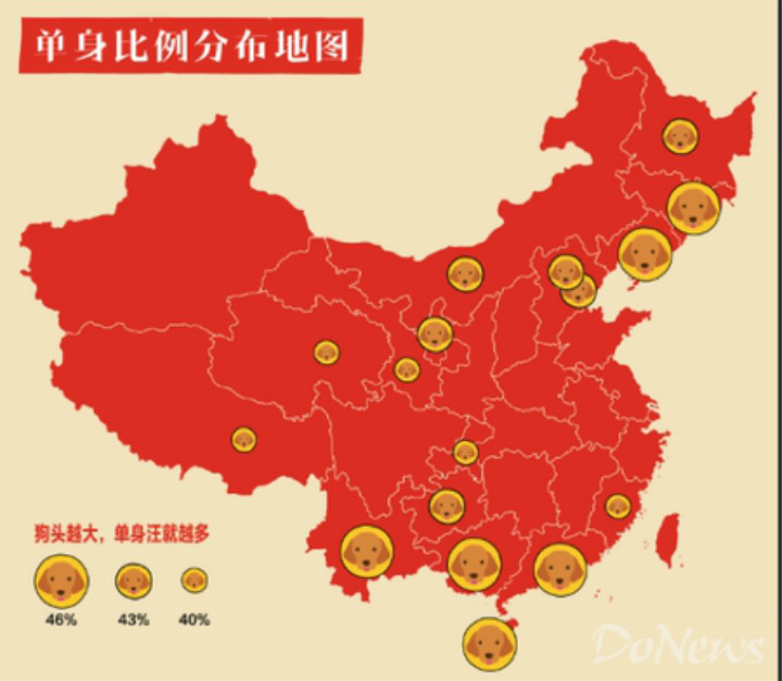 据了解,在这些地区,每 100 个人里大约就有 46 个单身狗。