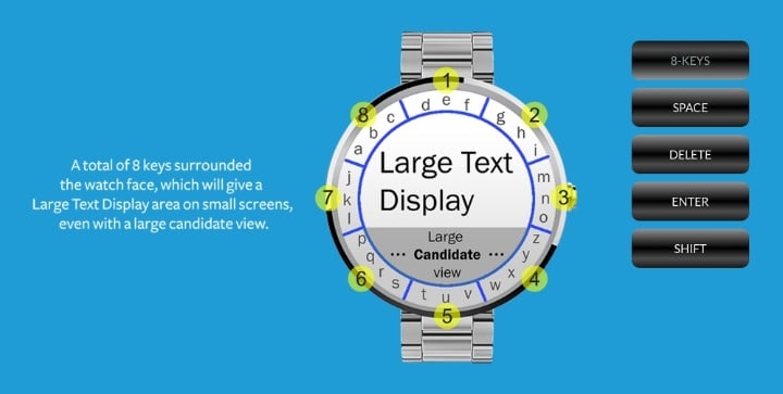 不同于 QWERTY 108 键键盘的布局,TouchOne 的键盘环绕在智能手表表盘周围,且圆形和方形表盘都适用。TouchOne 共有 8 个按键,每个键可代表 3-4 个字母。相比要占用将近一半屏幕的 QWERTY 键盘,能腾出不少空间用于显示文字。此外,为尽量减少占用手表屏幕空间,TouchOne 还支持手势控制:向左滑动是删除,上滑是切换,点按屏幕是空格……刚开始使用可能会有些手忙脚乱吧。
