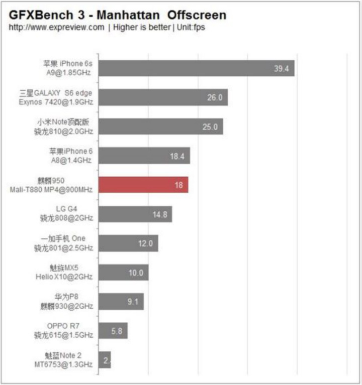 所以,麒麟 950 在 GFX Bench-3 测得的真实性能如下图:
