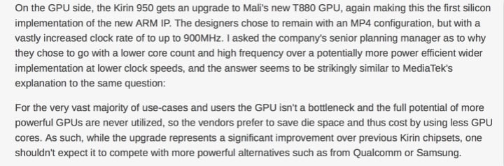 使用了 Adreno 530的骁龙 820 暂且不说,麒麟 950 整合了 Mali 图形最新一代的高端型号 Mali-T880( Mali-T880 允许从一到十六颗核心的堆叠),但只是 MP4 规格。相比 Exynos 8890 的 T880MP12,后者理论上图形处理能力是前者的三倍。即使对比上一代 Galaxy S6 /Note 5 使用的 Exynos 7420,也达到 MP8 规格(Mali-T760 核心)。