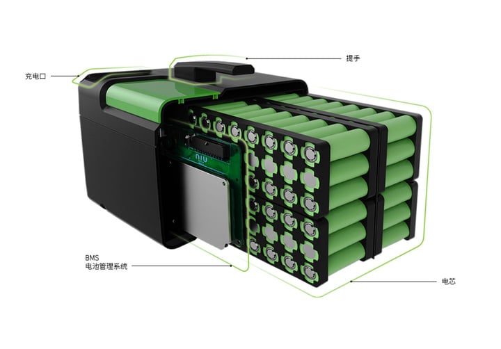 正如外界熟知的那样,最大的区别在于小牛电动车的锂电池供电方案。一般电动车使用的电池是方方正正的铅酸电池,储藏相同的电能它的重量可能要达到锂电池的数倍;循环使用寿命也偏短,600 次的充放电后,电量可能只剩下 10% 左右。小牛电动车使用的则是来自松下、LG 和三星的 18650 电池芯,每台车配备 170 节单节容量 2600mAh,600 次的充放电后,它的保有电量依旧可以有 70% 左右,重量在 10kg,即便是女生拎起来也没有多大负担。