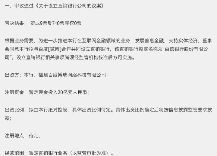 简而言之就是,百度与中信投入 20 亿元人民币,合作成立了一家名为“百信银行股份有限公司”的直销银行。具体细节可参照原文。