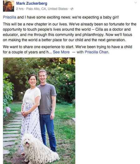 今年七月,扎克伯格在自己的 Facebook 页面上宣布妻子 Priscilla Chan 怀孕,这位互联网界的“大佬”如此大方地分享了自己家庭的喜悦,自然也获得了不少的祝福。